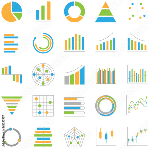 Set of business graph icon, Color object statistics finance presentation, Flat success report symbol vector. 640x640 pixels