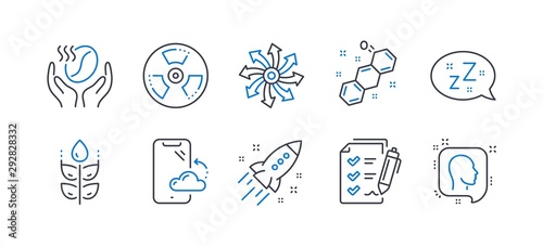 Set of Business icons, such as Coffee, Smartphone cloud, Versatile, Gluten free, Survey checklist, Startup rocket, Sleep, Chemical formula, Chemical hazard, Head line icons. Line coffee icon. Vector