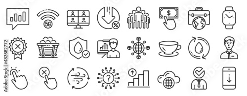 Set of Business icons, such as Loan percent, Reject click, Question mark icons. Wind energy, Analytical chat, Logistics network signs. 5g wifi, Cloud computing, Reject medal. Coal trolley. Vector