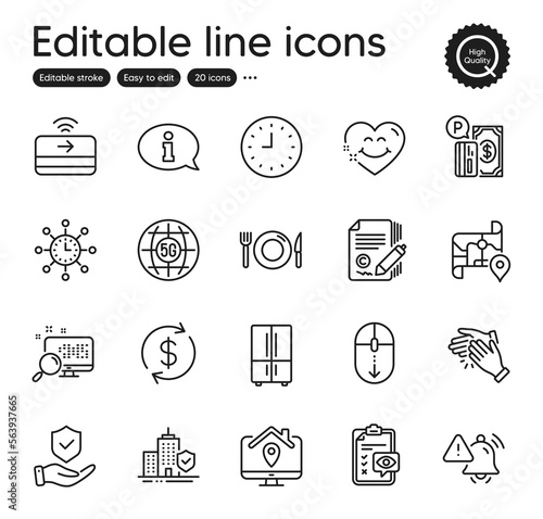 Set of Business outline icons. Contains icons as Attention bell, Apartment insurance and Search elements. Work home, Insurance hand, Eye checklist web signs. Usd exchange. Vector