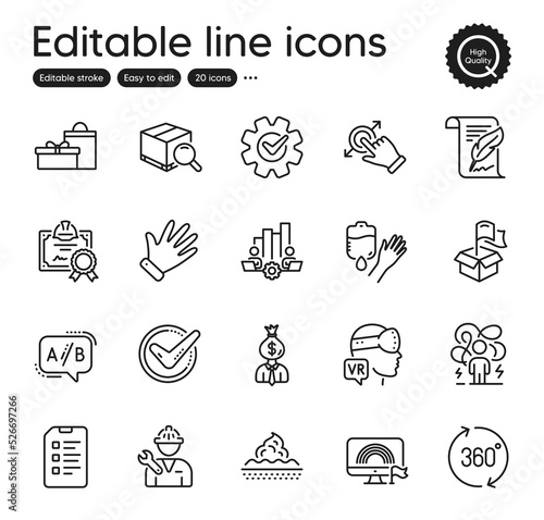 Set of Business outline icons. Contains icons as Search package, Gifts and Checklist elements. 360 degrees, Lgbt, Manager web signs. Blood, Repairman, Confirmed elements. Ab testing. Vector