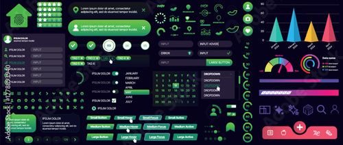 Set of buttons and interface elements for mobile apps and websites. Modern design for navigation, control and user interaction. Includes templates, menus, panels and icons