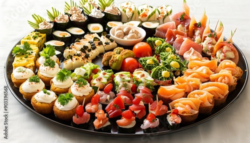 Set of canapes with meat, vegetables and cheese on the table