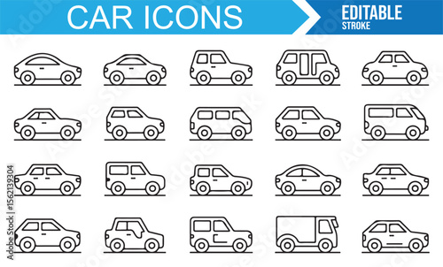 Set of car icons including various styles like sedans, trucks, and utility vehicles.