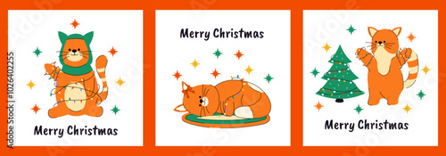 Set of cards in hand drawn style. Doodle. Christmas and New Year. Elements, figures, shapes, stars. Animal. Holiday. December. Winter. Isolated. Christmas lights. Christmas tree. Vector. Holly Jolly.
