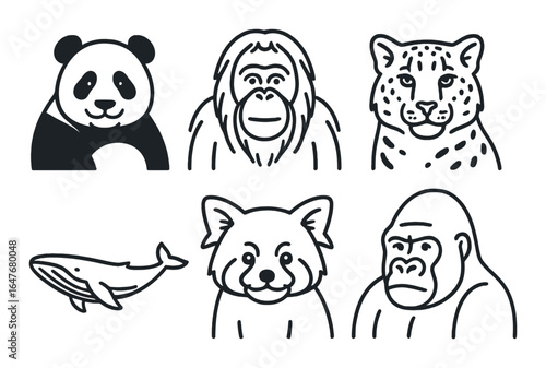 Set of cartoon animal icons featuring panda, orangutan, leopard, whale, red panda, gorilla