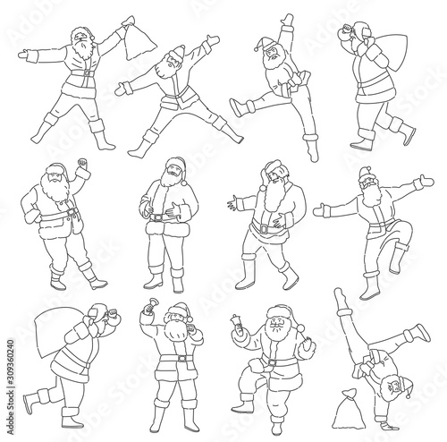 Set of cartoon Christmas illustrations isolated on color background. Funny happy Santa Claus character with gift, bag with presents, dancing. For Christmas cards, coloring banner. Line art vector.