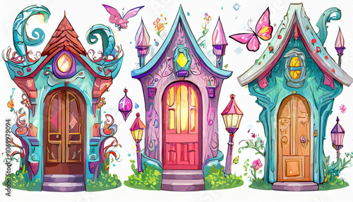 Set of Cartoon Fairy Doors and Magical Elements. designs surrounded by mystical items like tiny mushrooms, sparkles, vines, and tiny lanterns, perfect for fairy tale themes.