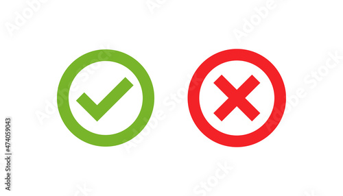 Set of check marks icons in a circle. Checkmark and cross in green and red. Tick marks: Accepted, Approved, Yes, Correct, Ok, Right Choices, Task Completion, Voting. Test question symbol.