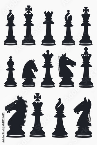 Set of chess pieces arranged neatly on a white background, great for illustrations and graphics