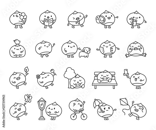 Set of chestnut characters enjoying park adventures with adorable activities, heartfelt emotions, charming animal, fun objects, and delightful poses in a kawaii cartoon style