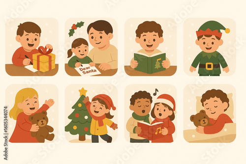 Set of Children Christmas Activity Icons in Flat Vector Style