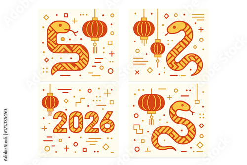 Set of Chinese New Year 2026 cards. Year of the Snake. Lunar zodiac symbol. Modern geometric design with serpent and lanterns for poster, banner, social media post.