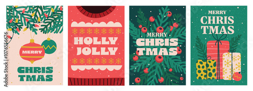 Set of Christmas and Happy New Year Floral Card templates. Christmas cards design with ornaments of branches, balls and ornaments. Modern minimal art poster, flyer, banner. Vector Illustration