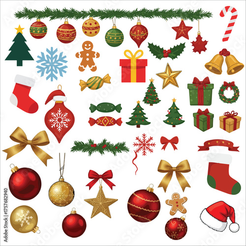 set of Christmas elements, Festive Christmas ornaments and decorations assortment vector for holiday cheer