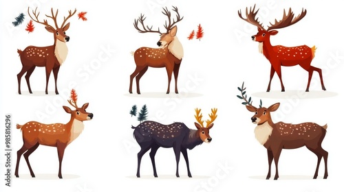 set of Christmas funny feer or moose with antlers and hooves on a white background