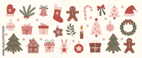 Set of Christmas Hand‑Drawn Elements — Cute Holiday Xmas Graphic Icons Featuring Wreath, Tree, Bow, Gift, Candle, Holly, Tree Toys, Candy, Red Socks for Greeting Cards