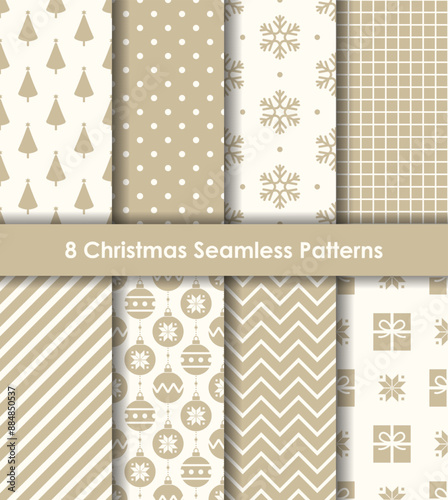 Set of Christmas seamless patterns in beige and white. Including trees, snowflakes, gift boxes, ornaments, and basic geometric patterns. Perfect for gift wrapping, stationeries, backgrounds, and more.