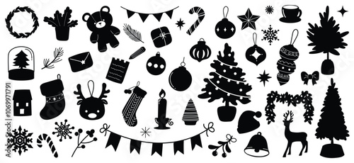 Set of Christmas silhouette outline vector elements. Christmas tree, reindeer, ornaments, winter, snowflake on white background.