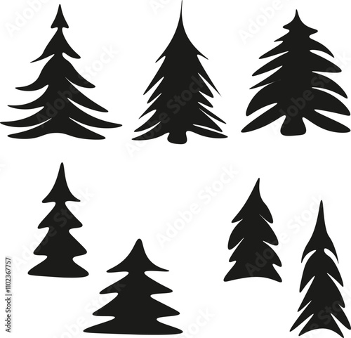 set of Christmas trees. Drawing of various pine trees in cartoon form