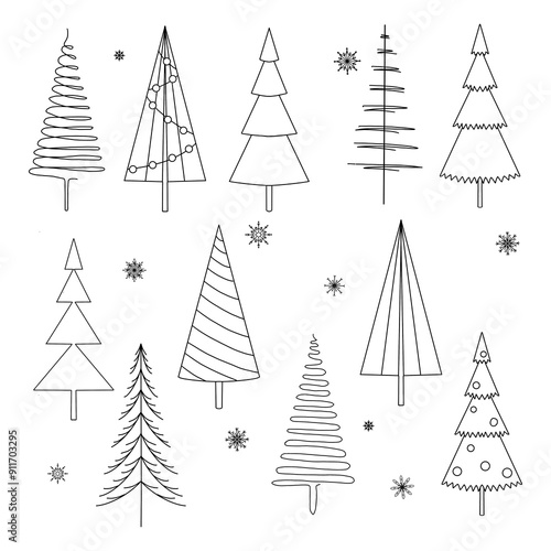 Set of Christmas trees snowflakes outline sketch illustration. Design Christmas decorations. Black and white drawing hand drawn. White background.