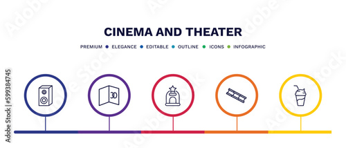 set of cinema and theater thin line icons. cinema and theater outline icons with infographic template. linear icons such as loud woofer box, 3d text, cinema ticket window, film negatives, smoothie