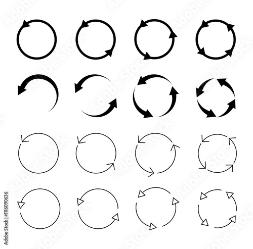 Set of circle arrows isolated. Circular Rotate arrow and spinning loading symbol. Different circular arrows of black color, different thickness and size. Vector