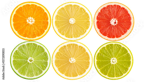 set of citrus fruits in wheel slices transparent png cutout isolated on white