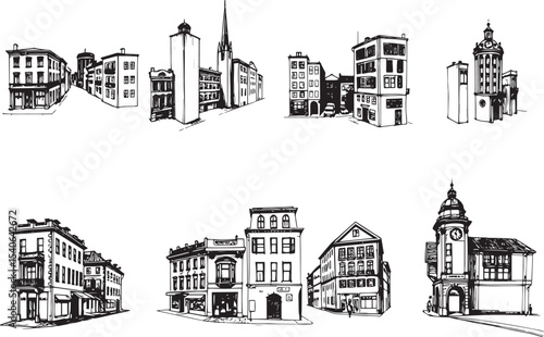 Set of city buildings. Line urban backdrop, different buildings on street, doodle street draw, outline cityscape hand sketch, flat houses. Hand drawn vector illustration