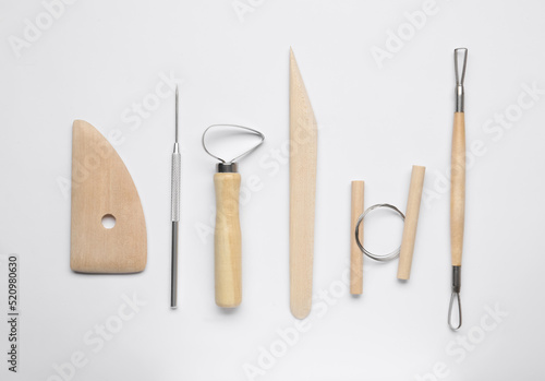 Set of clay modeling tools on white background, flat lay