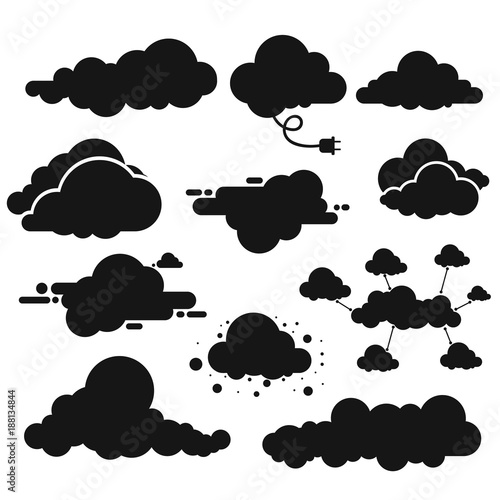 Set of cloud black icon. Cloud storage and sharing over the internet. Safe, secure and scalable data protection. Template for your design. Vector illustration. Isolated on white background
