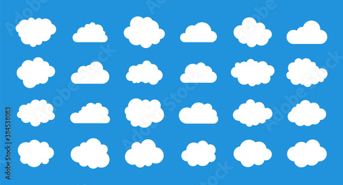 Set of cloud icons. White clouds on blue background. Vector flat style.