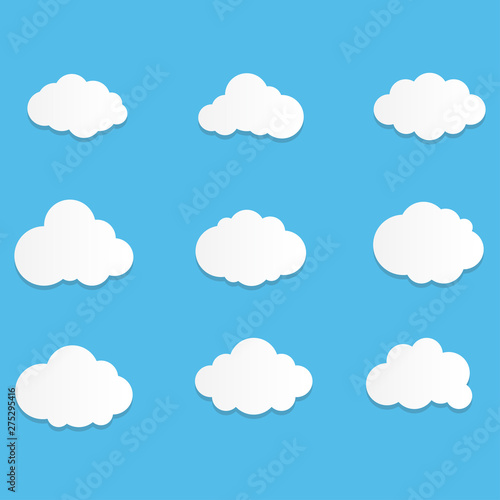 Set of Cloud Icons with flat style in blue sky background. Copy space. Speech Bubble, White blank hanging..