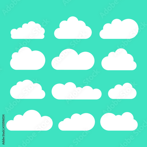 Set of clouds in blue sky. Cloud icon shape. Collection of different clouds, label, symbol. Graphic vector design element for logo, web and print.