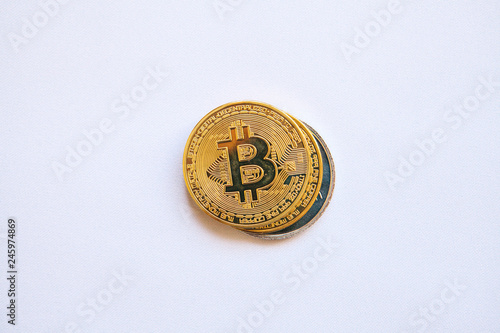 Set of coins bitcoin and other cryptocurrency on a white background. Bitcoin is higher than other coins. Modern electronic payment instrument.