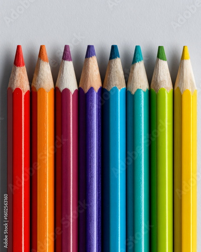 set of colored pencils neatly arranged, minimal white backdrop