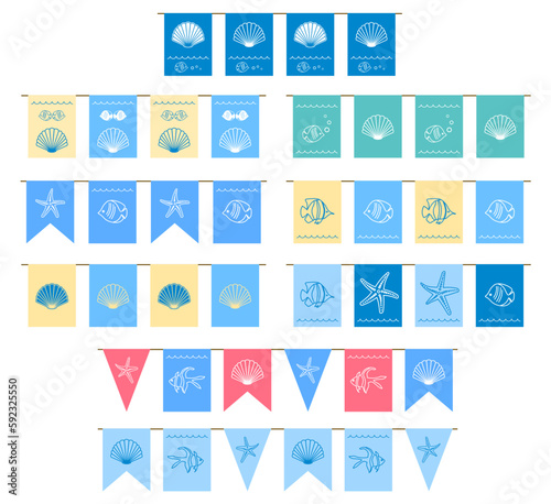 set of colorful decorative flags with silhouettes of fishes and shells and sea stars - vector decorations