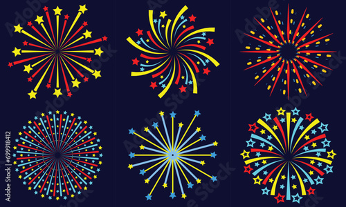 Set of colorful fireworks. Festive explosion of fireworks with stars and sparks.celebration party, anniversary or festival, explosion stars. Celebrations birthday or Christmas. Vector illustration.