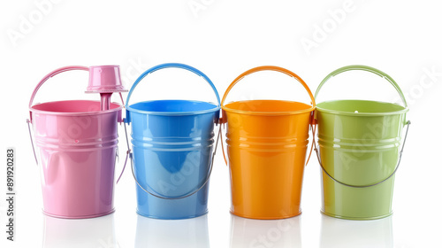 set of colorful metal buckets isolated on white background