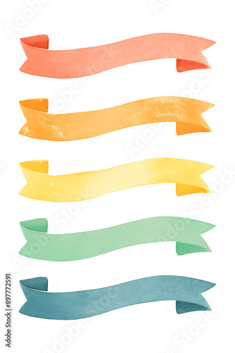 Set of colorful watercolor ribbons isolated on transparent background. Red, green, yellow, orange and blue color. Ribbon collection with copy space for design