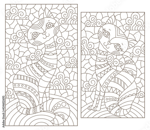 Set of contour illustrations in stained glass style with cute cartoon cats, dark outlines on a white background, rectangular image