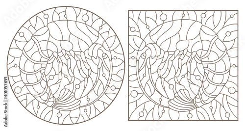 Set of contour illustrations in stained glass style with shrimps on a background of water and air bubbles, dark contours on a white background