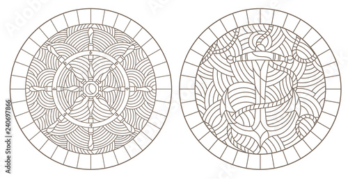 Set of contour illustrations of stained glass Windows on the marine theme, ship anchor with rope and steering wheel on the background of waves, dark contours on a white background