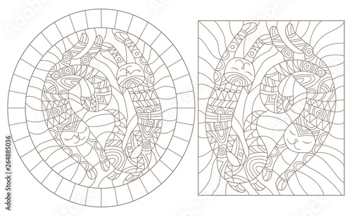 Set of contour illustrations of stained glass Windows with cute cartoon cats , dark contours on a white background