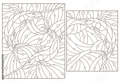 Set of contour illustrations of stained glass Windows with fish, fish sailboat and fish sword, dark contours on white background