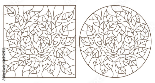 Set of contour illustrations of stained glass Windows with flowers, roses and leaves , dark contours on white background