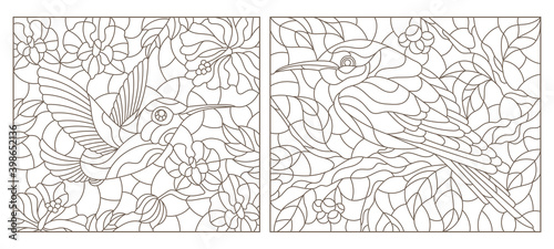 Set of contour illustrations of stained glass Windows with Hummingbird birds and flowers, dark outlines on a white background, rectangular images