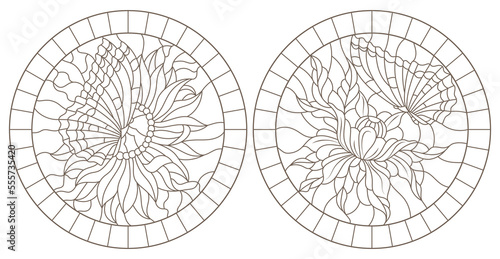 Set of contour illustrations of stained-glass Windows with flowers and butterflies, dark contours on a white background