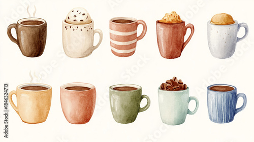 Set of cozy decorative coffee cups in pastel colors