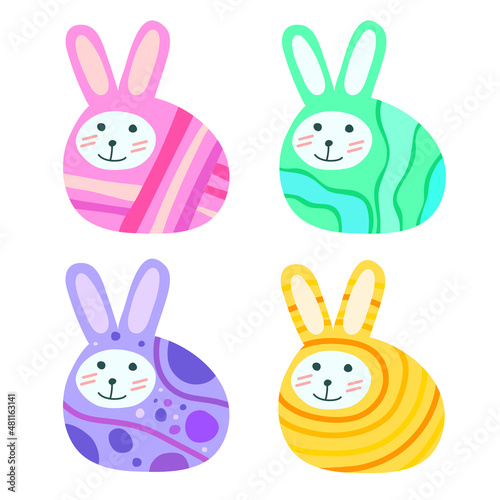 Set of cute abstract Easter bunnies, festive, bright decorative rabbits in flat cartoon style, hare as Easter painted eggs. Isolated on a white background. Vector illustration